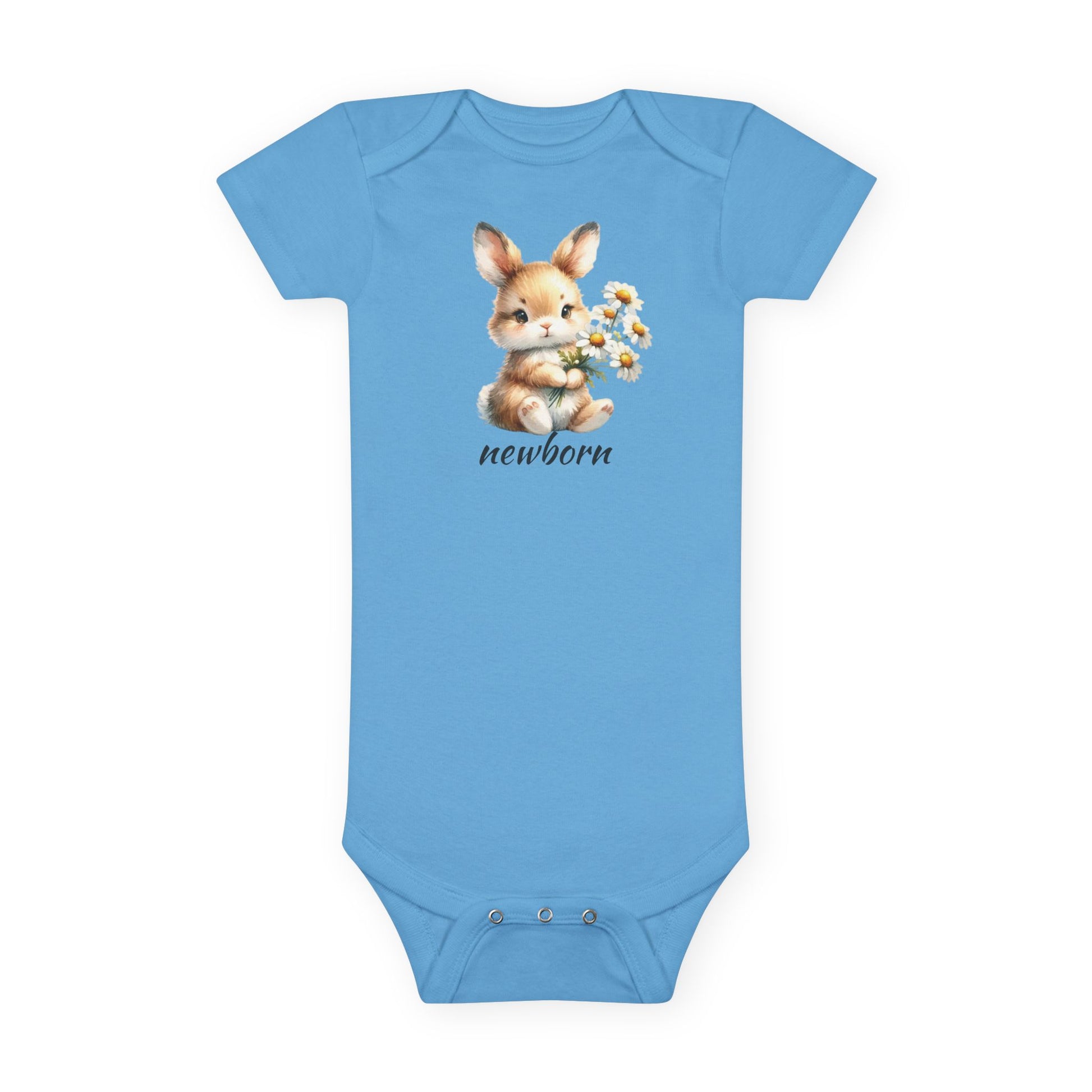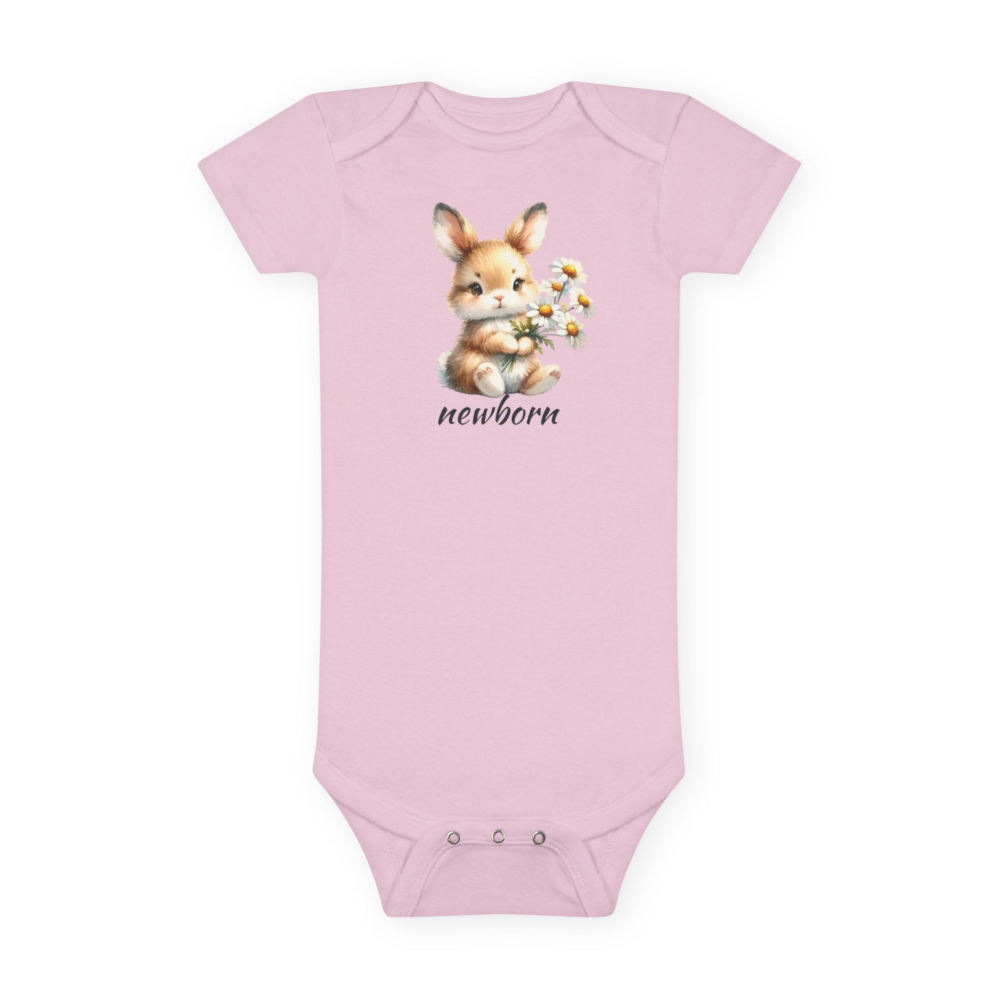 This adorable Baby Short Sleeve Onesie is the perfect addition to any little one's wardrobe. Made from 100% cotton, it offers a soft, comfortable feel against the baby’s skin, ensuring they stay cozy all day long. The charming design, featuring a cute bunny with flowers, creates a warm and joyful vibe that makes it ideal for family gatherings, baby showers, or just everyday play. Suitable for newborns and infants, this onesie is a delightful gift for new parents to celebrate special occasions such as birthdays, holidays, or baby announcements. Practical yet stylish, it fits seamlessly into a busy parent’s life, making outfit changes a breeze while keeping their little star looking adorable!