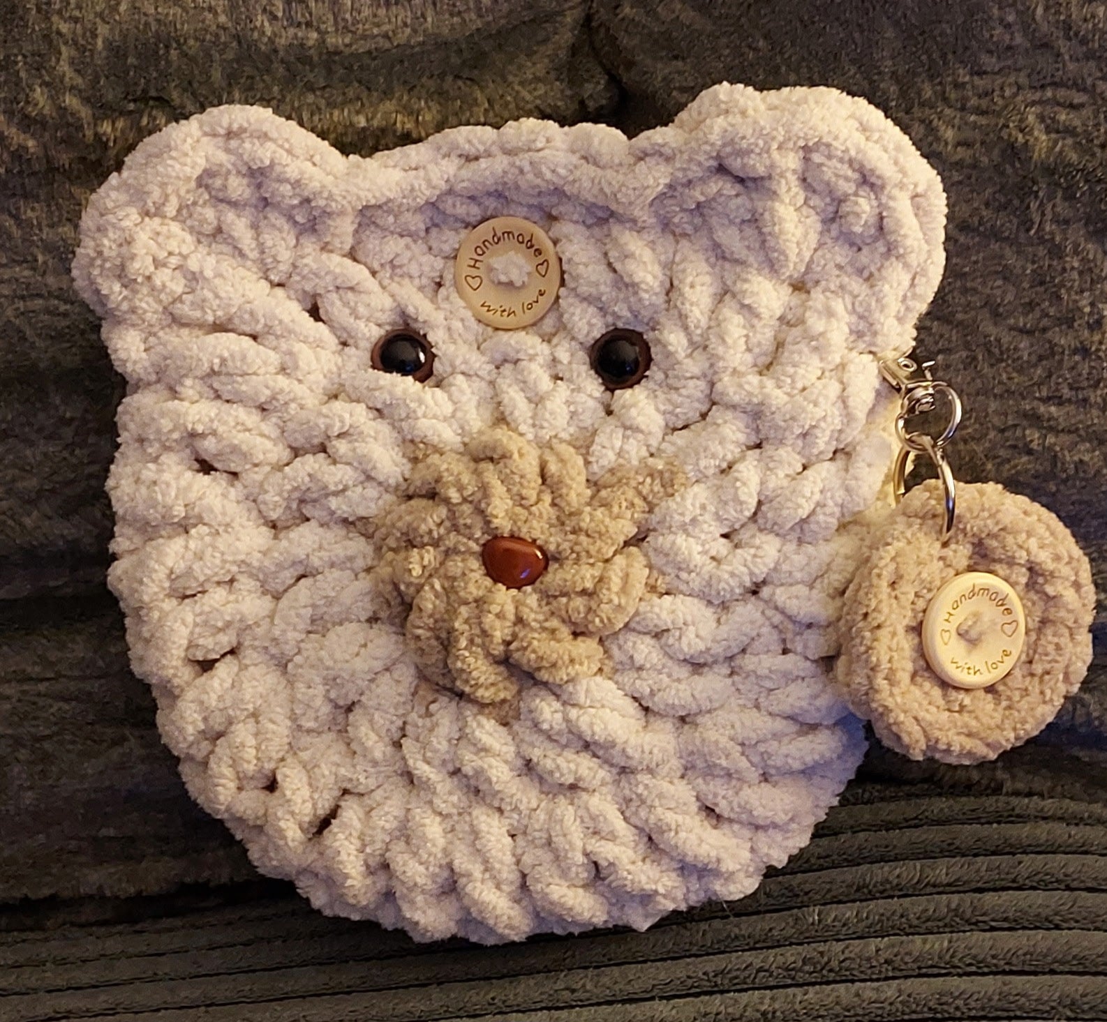 Add a playful charm to your everyday essentials with our handmade bear wristlets! These delightful wristlets feature an adorable bear face, complete with button eyes and nose, giving them a unique personality.