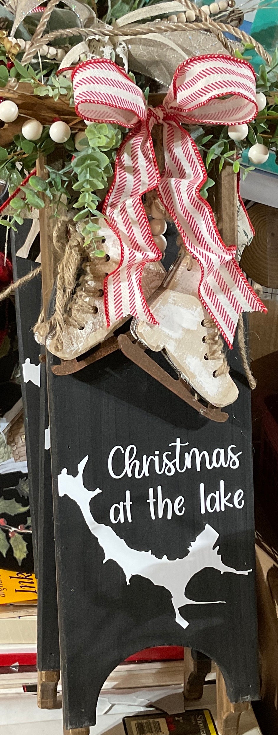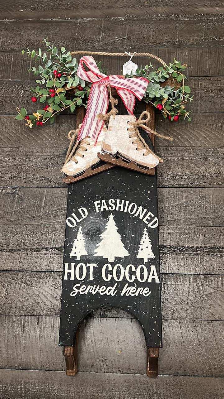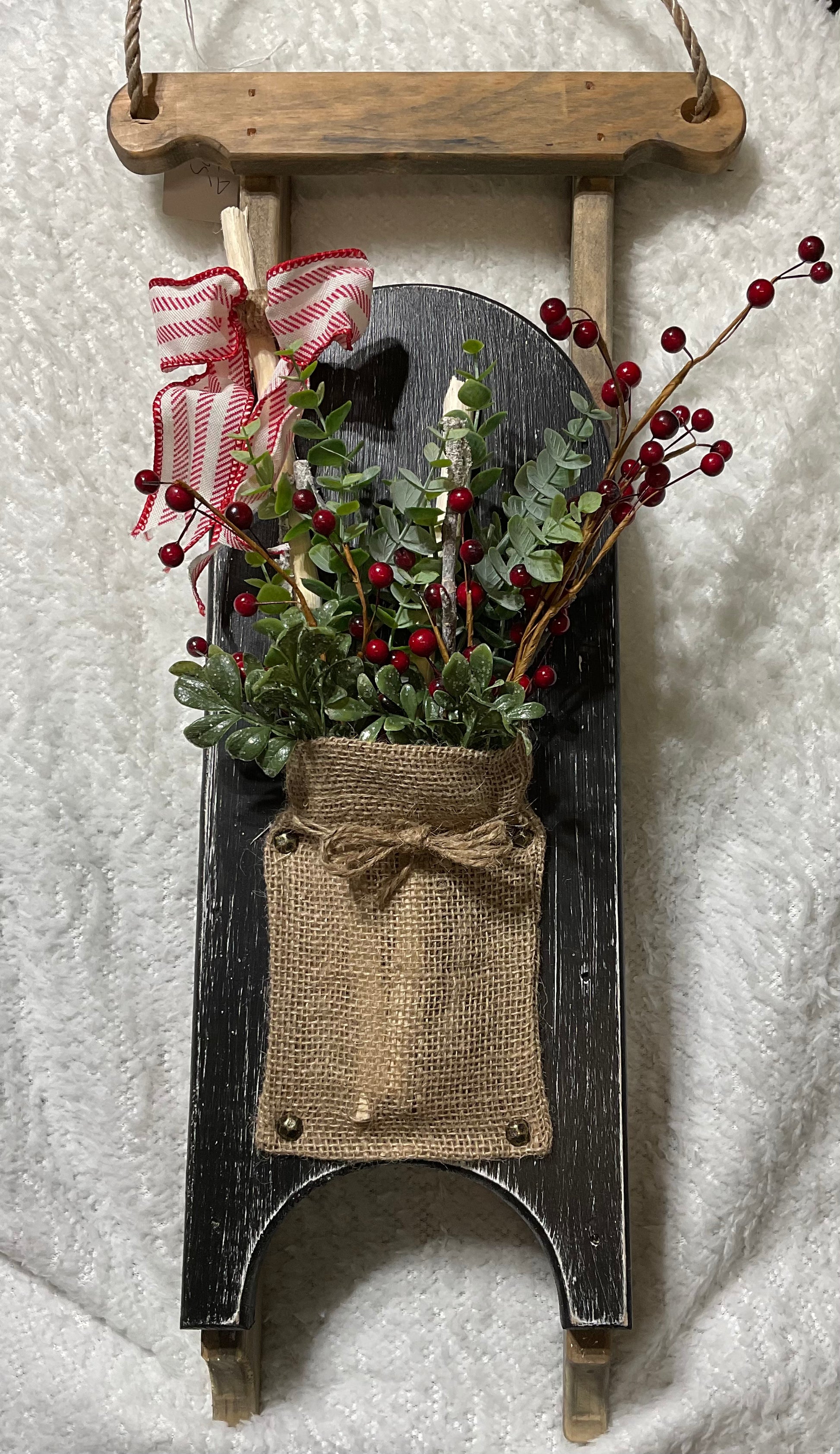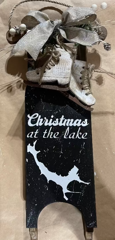 Approximately 7” x 18” decorated rustic sled. Includes greenery, ribbon, and other available winter embellishments.