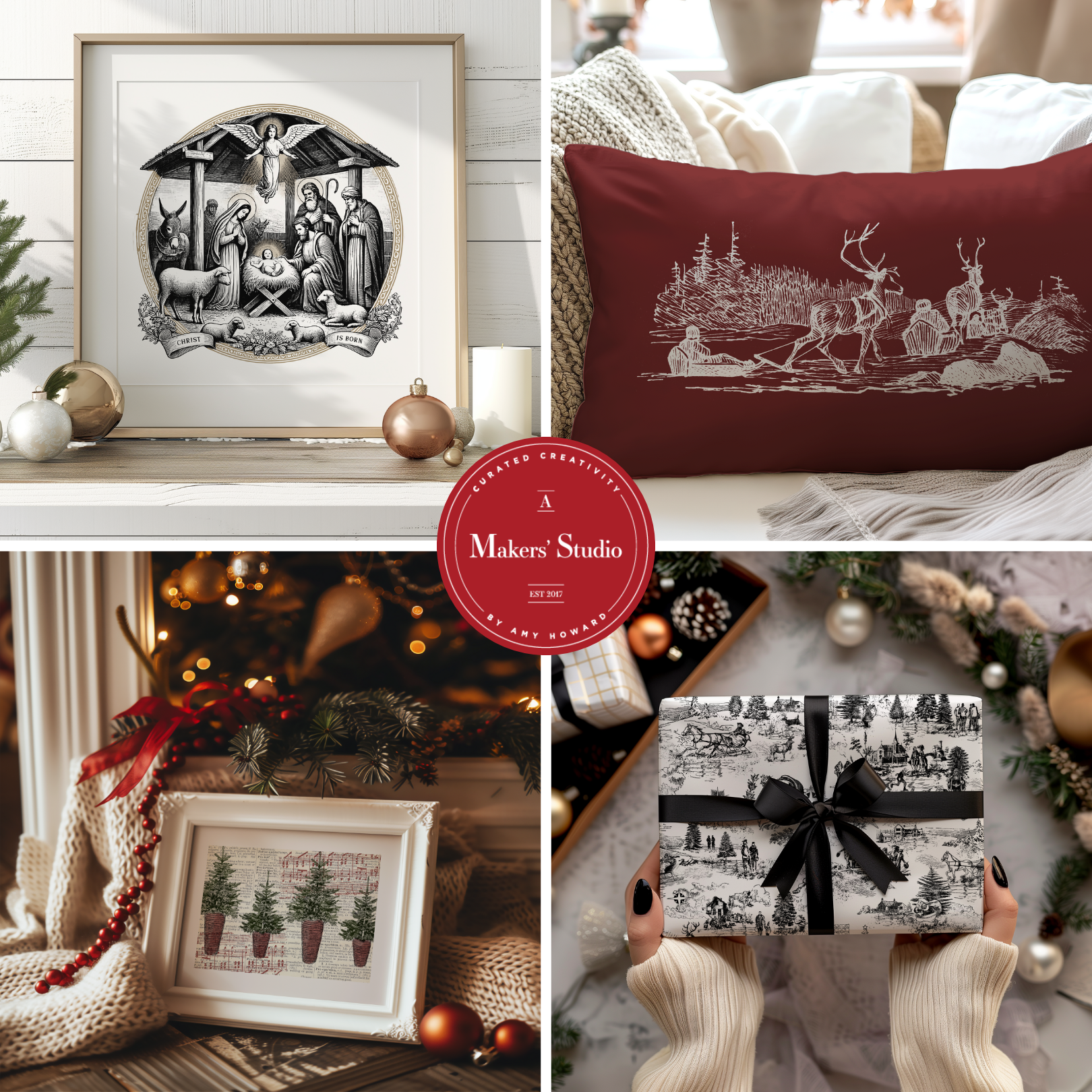 - Christmas Toile (12x12): Add a touch of old-world elegance with this toile-inspired design, perfect for accenting pillows, linens, or frames.